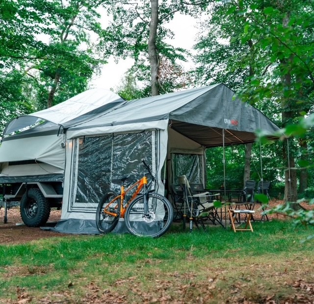 Der Family Faltcaravan mit einer Fläche von 11 m² (Hauptzelt) ist für kleine Familien konzipiert.